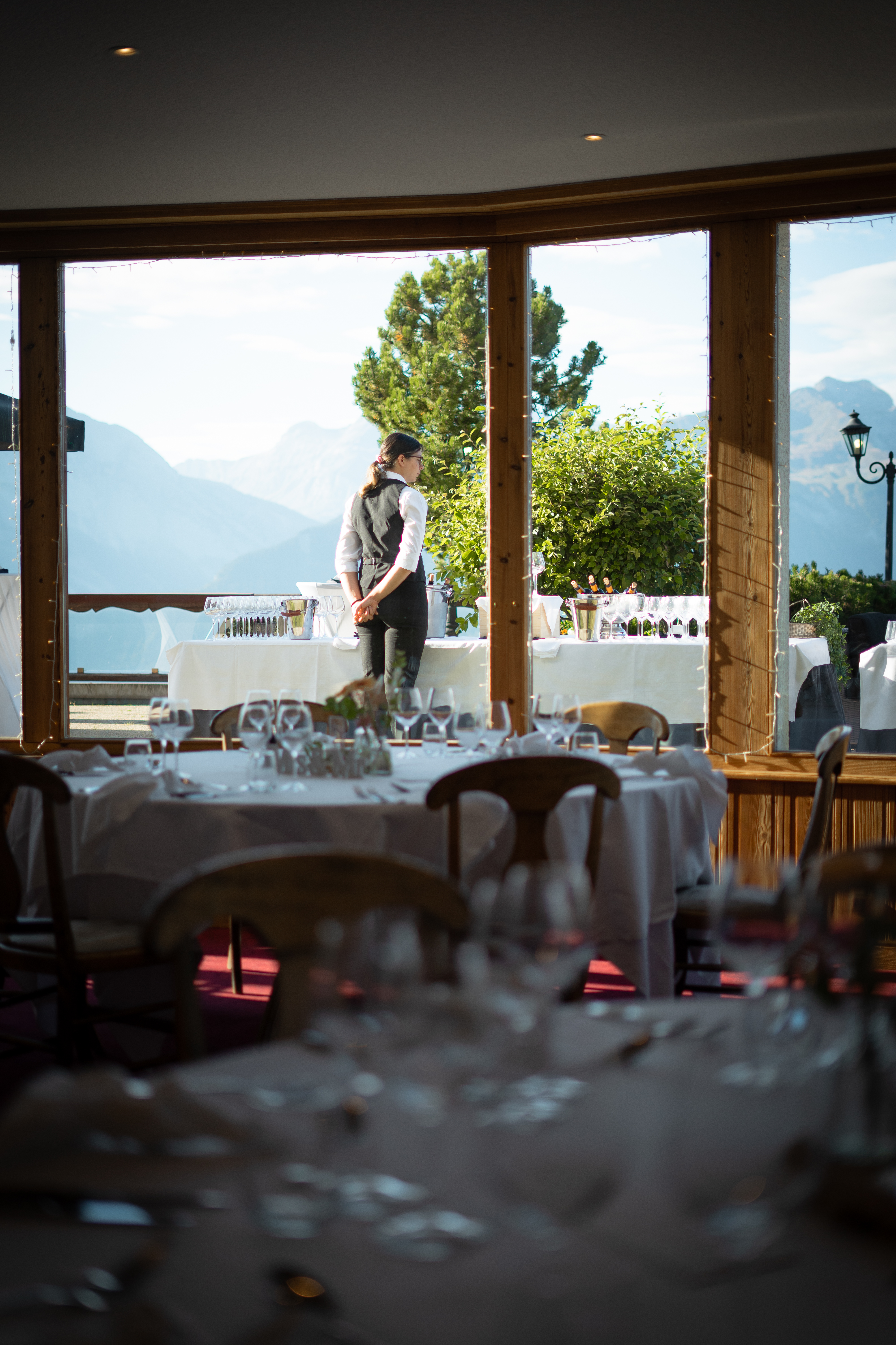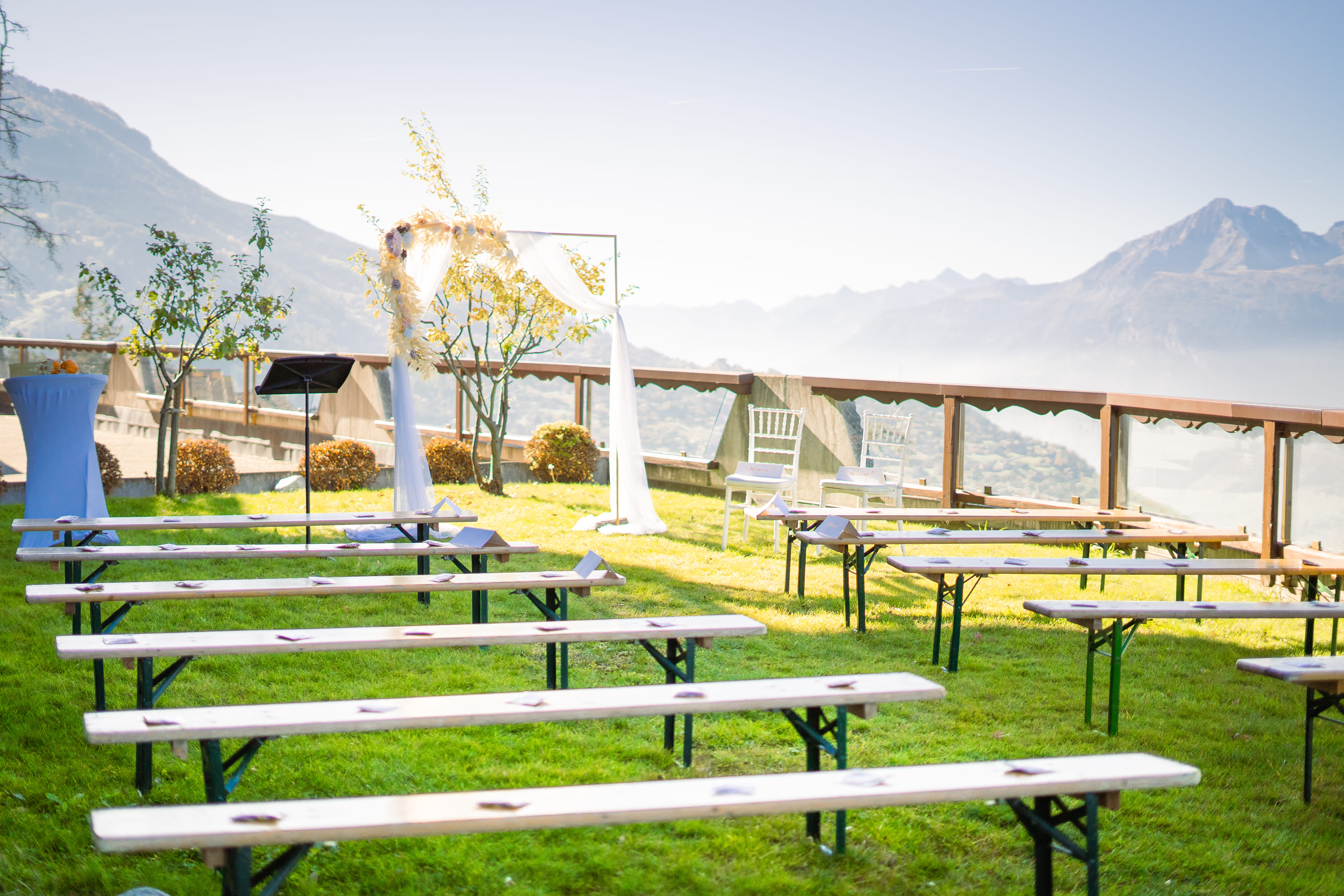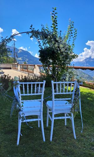 Lieu de réception : Nos trois salons, modulables et pouvant accueillir jusqu’à 150 personnes, sont à votre disposition pour créer l’événement de vos rêves. Profitez également de notre grande terrasse offrant une vue imprenable sur la vallée, idéale pour un cocktail de bienvenue ou même pour une cérémonie en plein air. L'architecture traditionnelle de notre hôtel, typique de la région valaisanne, apporte une touche authentique et chaleureuse, au cœur des majestueuses Alpes suisses. Un cadre unique pour une célébration inoubliable.